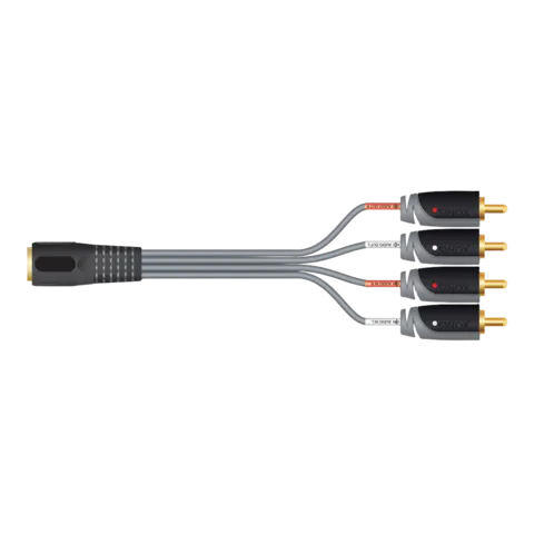 De fire RCA-hannpluggene er delt opp som to stereopar for hhv. inn- og utgang, og er fargekodet i venstre og høyre kanal.