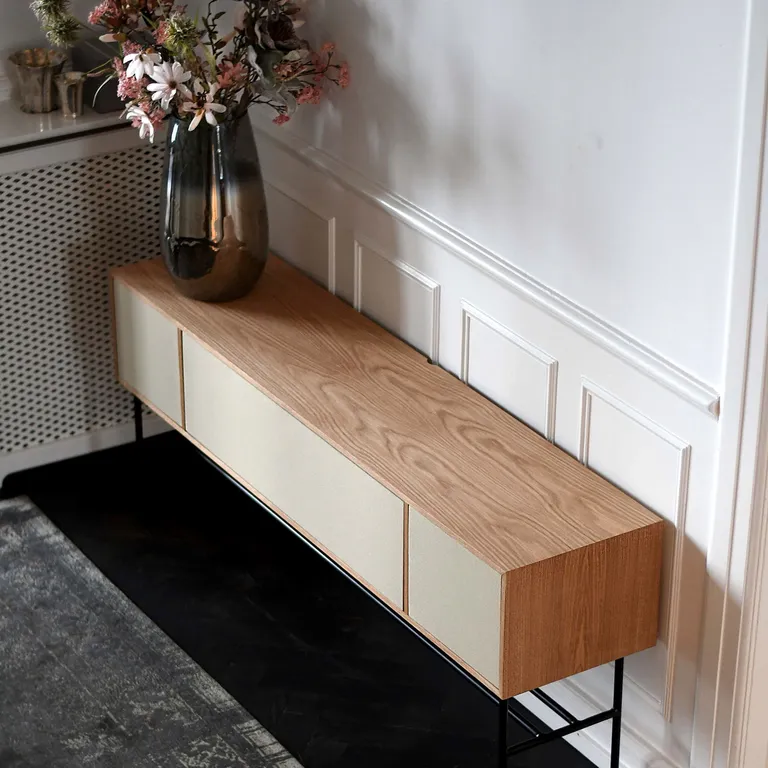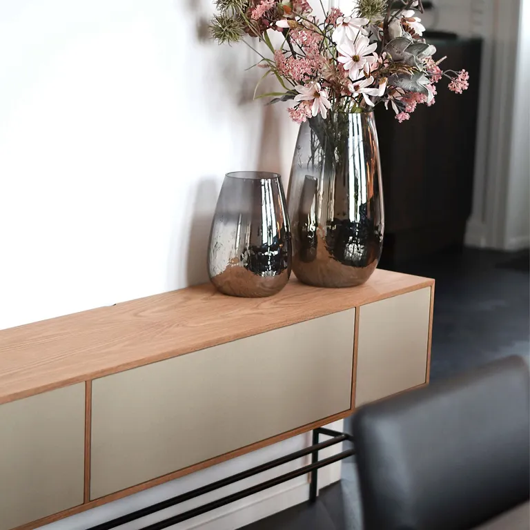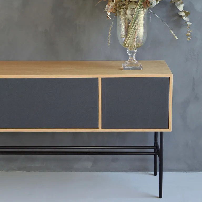 Alt du trenger er bygget inn i møbelet, og alt du må gjøre er å koble til TV og strøm for å få flott og fyldig stereolyd. Enklere og mer elegant kan det nesten ikke gjøres, og finishen er på topp med ekte trefiner og tekstildetaljer fra danske Gabriel (stoffdører kjøpes separat).