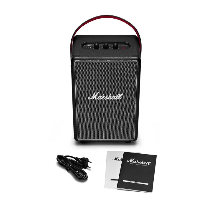 Tufton er en kraftig, bærbar Bluetooth-høyttaler med batteri til over 20 timers spilletid, så du kan feste med vennene hele natten. Høyttaleren er laget i samme stil som Marshalls legendariske gitarforsterkere med rått metalgitter, ikonisk Marshall-logo og kontrollknapper på toppen. Remmen er foret med lekkert rødt velur på innersiden, som du også ser det på mange gitarkasser.