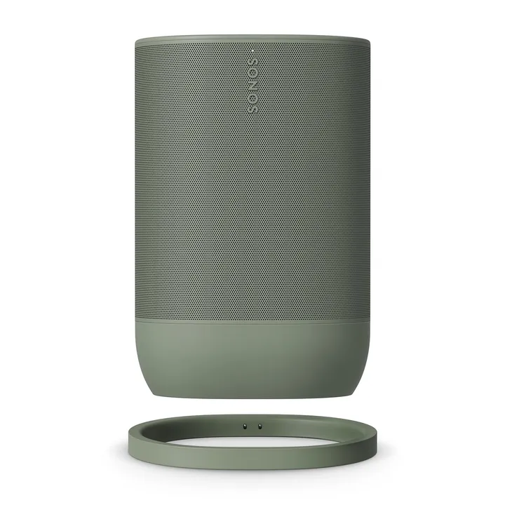 Sonos Move 2 fås i flere farger. Trådløs ladebase følger med. Veggfeste, gulvstander og USB-C adapter til line-in/Ethernet fås som ekstratilbehør.