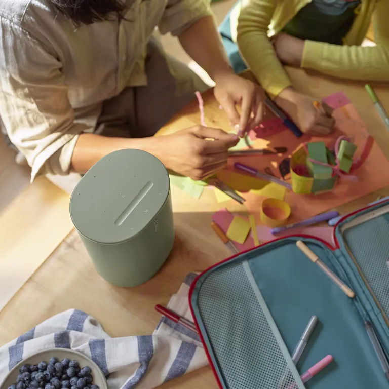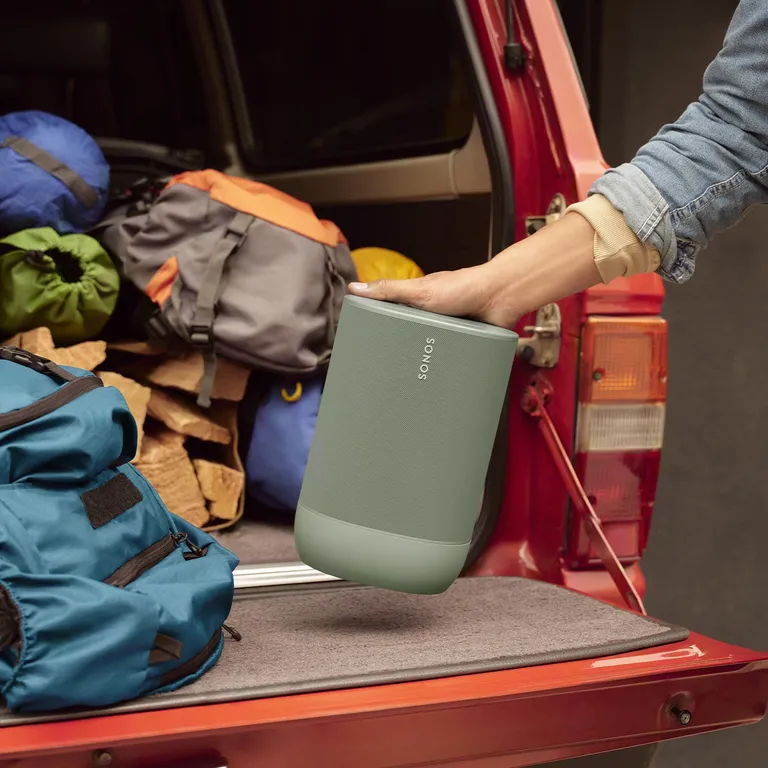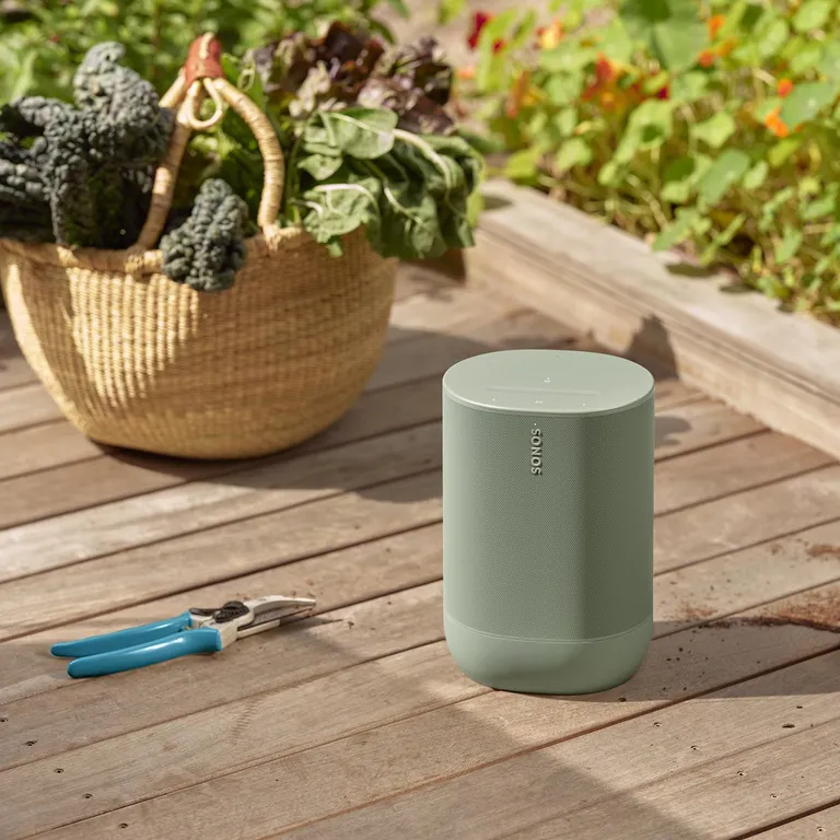 Via touch-knapper på toppen kan du sette musikken på pause, skippe en sang eller skru opp, selv om du ikke har telefonen din på deg. Og du kan opprette trådløs forbindelse mellom Sonos Move 2 og andre Sonos-høyttalere i huset (multirom). Fyll forskjellige rom med forskjellige sanger, eller grupper dem for å få øyeblikkelig lyd overalt.
