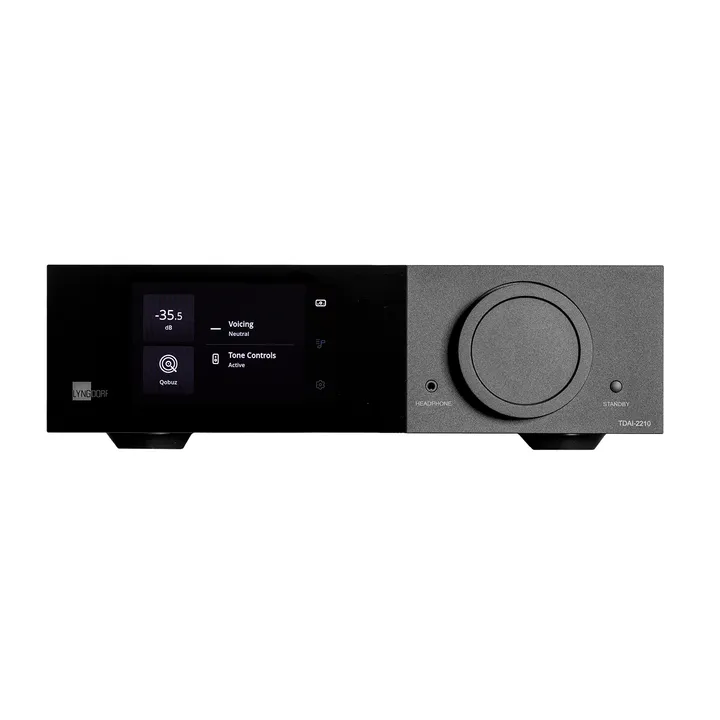 Lyngdorf TDAI-2210 fås i sort finish. RoomPerfect-mikrofon/stativ og IR-fjernkontroll følger med.