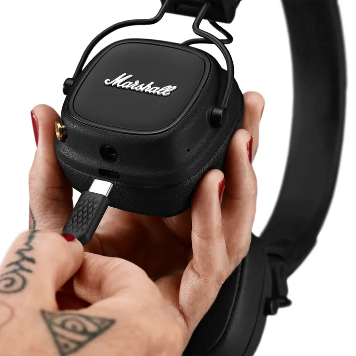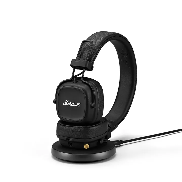Batteritiden på Marshall Major IV er på imponerende 80 timer. Går batteriet likevel tomt for strøm, kan du fortsatt høre på musikk med den inkluderte minijack-kabelen, som med vanlige passive hodetelefoner. En praktisk mulighet er at du også kan lade hodetelefonene trådløst på en standard Qi-lader (ekstrautstyr).
