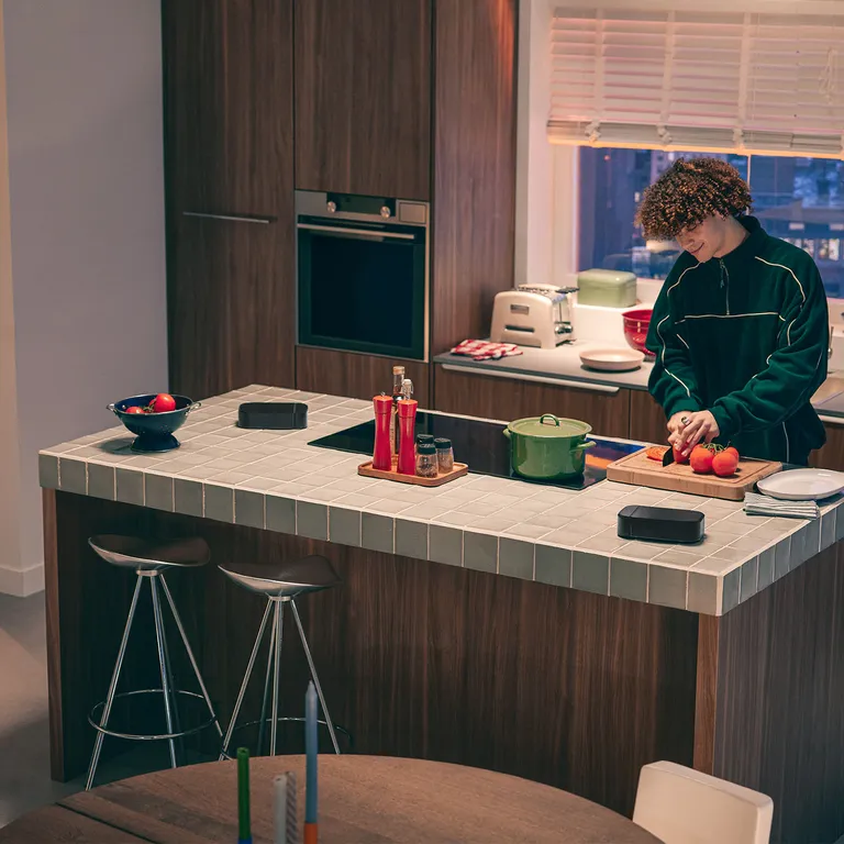 Du kan også bruke høyttalerne som mobile Bluetooth-høyttalere, til og med i stereo, hvis du parer dem som høyre og venstre kanal. Spill favorittspillelisten din på kjøkkenet, eller flytt TV-lyden fra stuen ut dit, hvis du for eksempel vil følge med på fotballkampen mens du tilbereder middagen. Du kan også velge å spille TV-lyden utelukkende på bakhøyttalerne hvis du vil unngå å vekke barna.