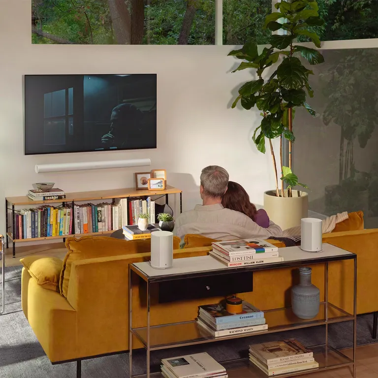 De to separate diskantelementene i Sonos Era 100 SL gir deg en fin oppløst lyd, men det blir mye bedre hvis du kombinerer to stykker i høyre/venstre stereo. Du kan også bruke to stykker som trådløse surround-bakhøyttalere, for eksempel sammen med en matchende Sonos-lydplanke. På den måten får du en superenkel og velspillende Sonos hjemmekino, og du kan se frem til utallige timer med fengslende film- og TV-opplevelser med full surroundlyd – uten vanskeligheter, og uten skjemmende kabler på tvers av stua!