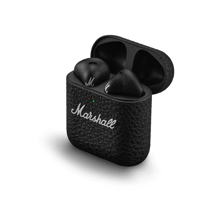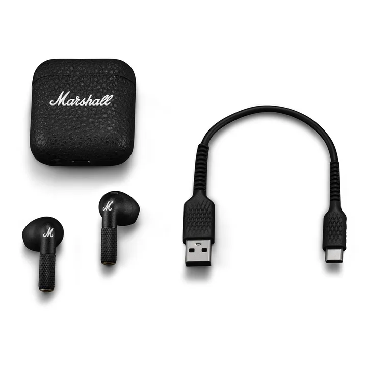 Marshall Minor IV fås i sort finish. USB-C ladekabel og ladeetui medfølger. Trådløs Qi-lader fås som ekstratilbehør.