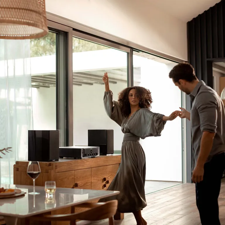 Skifter du tilbake til f.eks. CD eller musikstreamer, er du i trygg havn med luksus-stereo. På denne måten kan du ha et surroundanlegg tilkoblet, hvis du gjerne vil ha multikanals lyd til din filmsamling, men prioriterer musikk i to kanaler høyest. En enkel og elegant løsning, og du gjør byttingen direkte via dreieknappen på fronten.