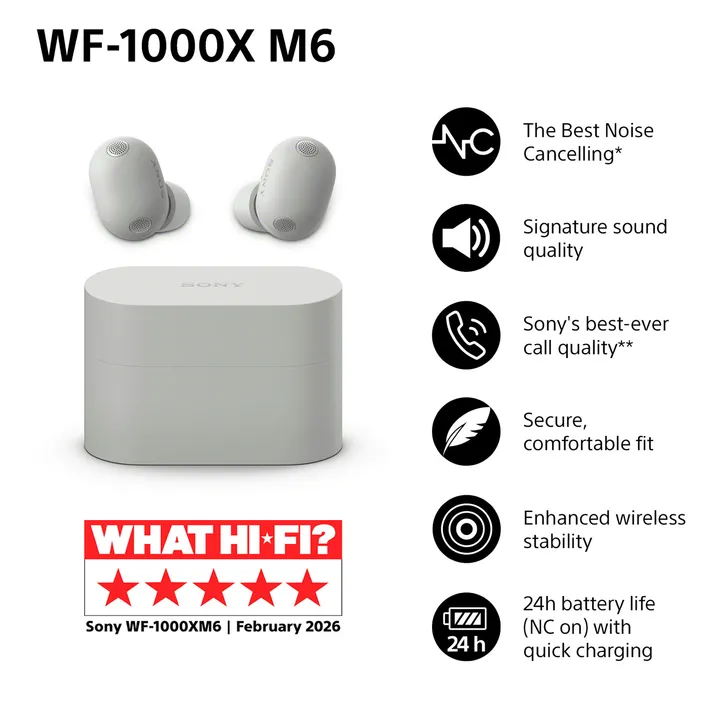 Sony WF-1000XM6 – True Wireless trådløse in-ear ørepropper med fremragende lydkvalitet, lekker finish, forbedret støyreduksjon og førsteklasses samtalekvalitet