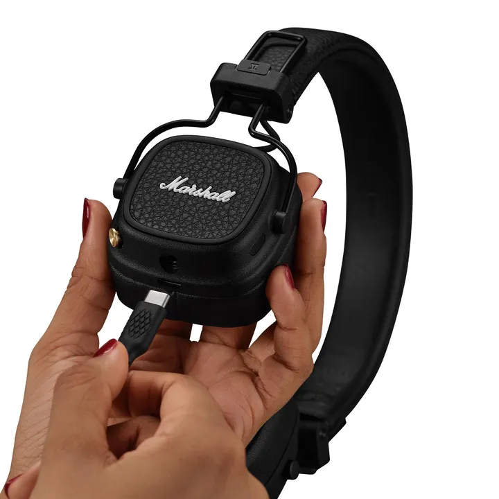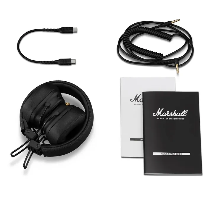 Marshall Major V fås i sort finish. USB-ladekabel og lydkabel følger med.