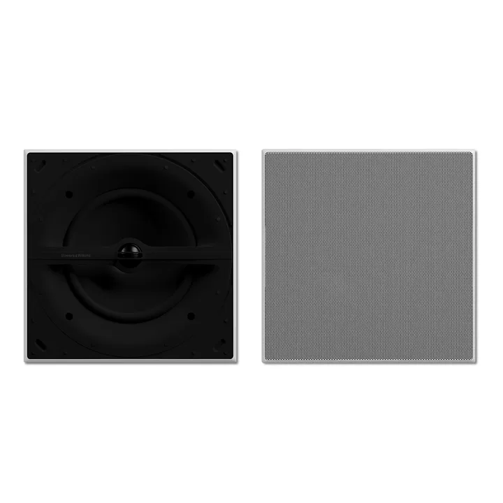 Den runde standardfrontgrillen kan også byttes til en kvadratisk utgave (kjøpes separat), om du skulle ønske det av innredningsmessige årsaker. Du trenger ikke skjære nytt hull i taket – du bare klikker den kvadratiske rammen fast på kanten av høyttaleren og monterer den nye grillen. Dermed finner du alltid den løsningen som passer best hjemme hos deg.
