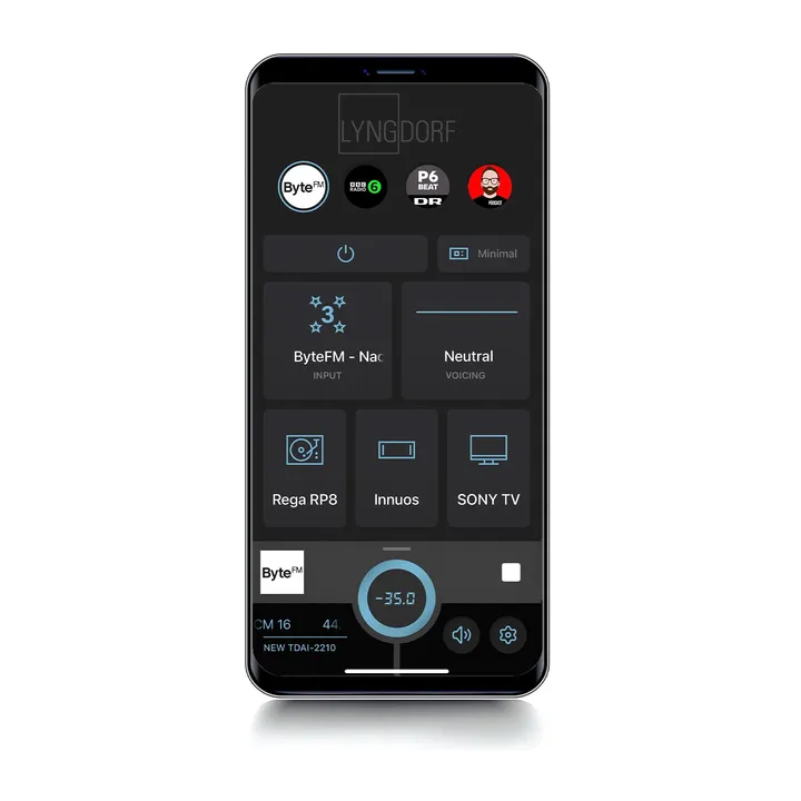 - Styring med dreieknapper eller Lyngdorf Remote app (IR-fjernkontroll fås som ekstrautstyr)