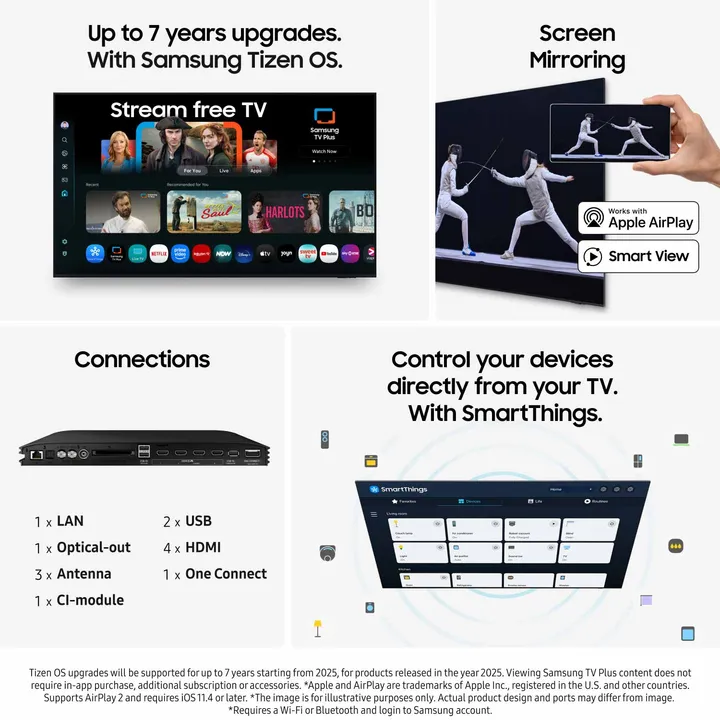 S95F har Samsungs egen Smart TV-plattform Tizen, som gir deg en rask og intuitiv opplevelse med lynrask tilgang til Netflix, Disney+, YouTube og andre populære tjenester. Du kan styre TV-en med stemmen via fjernkontrollens mikrofon (Amazon Alexa) eller en separat smarthøyttaler (Google Assistant), og med Multi View kan du dele skjermen og se to ting samtidig.