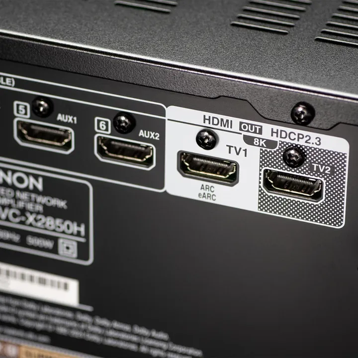 AVC-X2850H har to HDMI-utganger i parallell, slik at du kan koble til for eksempel en ekstra TV på kjøkkenet i tillegg til din primære TV eller projektor i hjemmekinoen. På baksiden finner du også 6 HDMI-innganger, hvorav 3 støtter HDCP2.3, 8K og oppskalering helt opp til 8K/60Hz via HDMI. Det betyr i praksis at du kan koble alle de digitale bildekildene dine (inkl. 8K) direkte til receiveren og sende bildet videre til TV-en eller projektoren i best mulig kvalitet via ett enkelt HDMI-kabel. Med Audio Return Channel kan du også sende lyden fra TV-en tilbake til receiveren via samme HDMI-kabel – også inkludert Dolby Atmos via eARC-funksjonen.*
