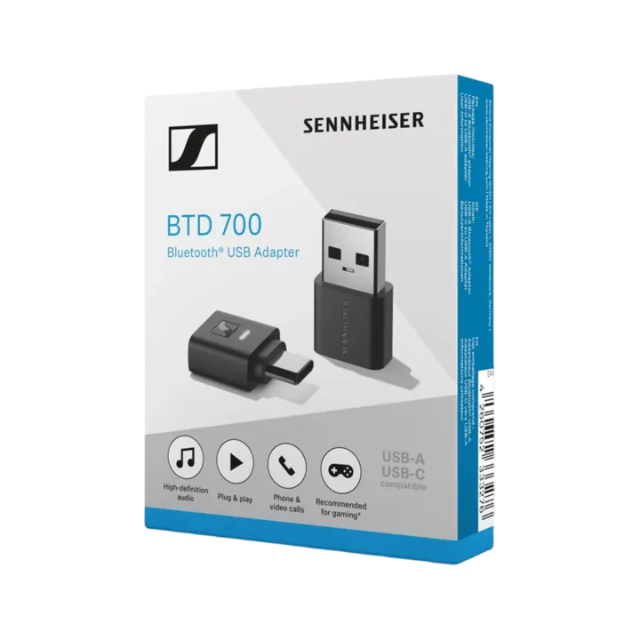 Sennheiser BTD 700 er en genial liten Bluetooth-dongle som du kan bruke på alle telefoner og datamaskiner med audio-ut via USB-C. BTD 700 overtar Bluetooth-overføringen og gir deg høykvalitets lyd via aptX Lossless eller aptX Adaptive, selv om enheten din kun har standard Bluetooth (SBC) eller AAC (iOS).