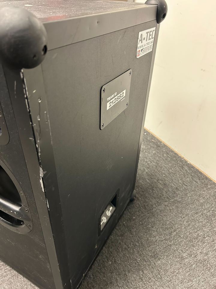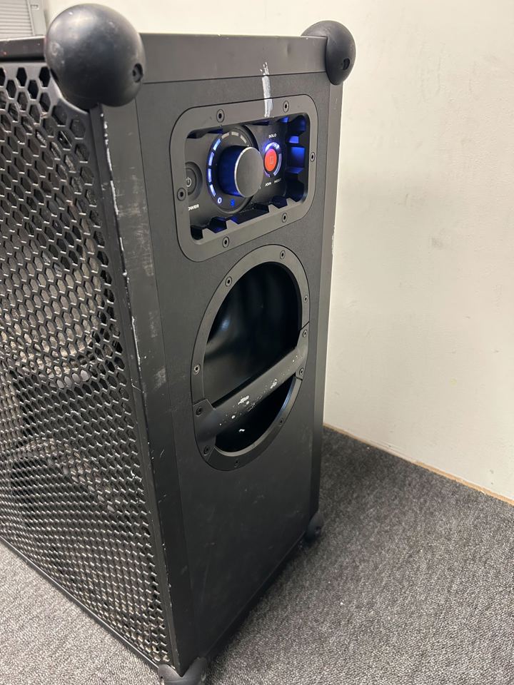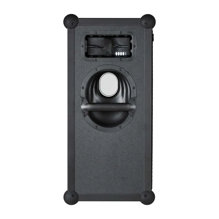 På høyresiden av høyttaleren kan du bruke touch-knapper til å slå av og på, bruke TeamUp-funksjonen og justere volum, som går helt opp til 11 – en snedig liten detalj. På venstre side kan du på få sekunder skifte til et nytt batteri hvis det gamle skulle være flatt (ekstrautstyr). Begge sider er utstyrt med håndtak, slik at du enkelt kan ta med deg høyttaleren overalt.