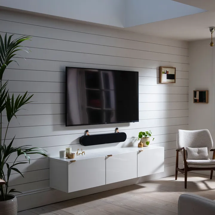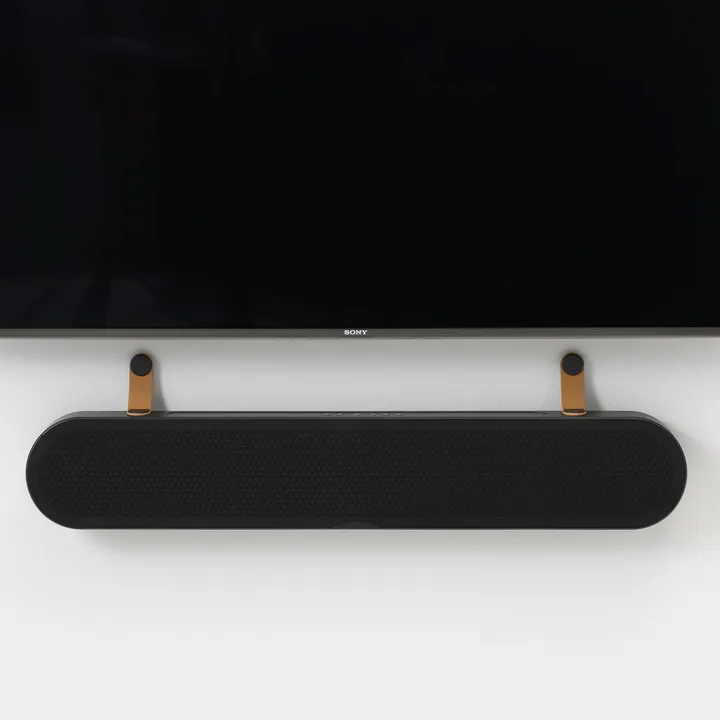 Du kan posisjonere KATCH ONE optimalt på tre forskjellige måter. Hvis du har plass under TV-en, så kan du bruke de to smarte, inkluderte lærstroppene, som samtidig skjuler kablene elegant. Skal høyttaleren helt tett på TV-en, så bruker du det integrerte ”nøkkelhull”-festet. Og vil du heller ha den stående fritt på en hylle eller et TV-møbel, så bruker du de to medfølgende treføttene. Her bestemmer du helt selv hvordan lydplanken din skal plasseres.