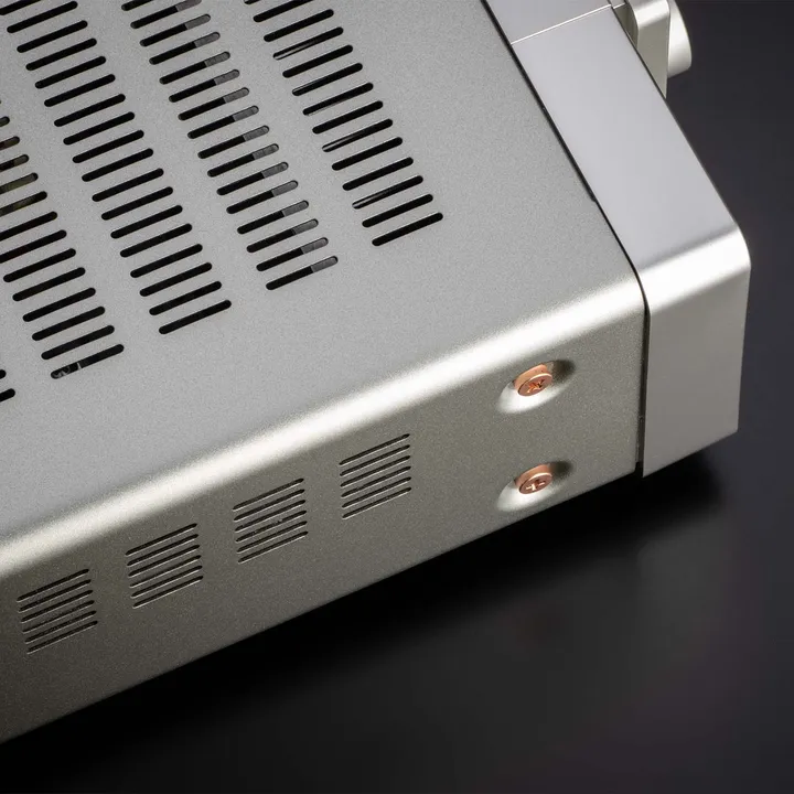 STEREO 70s er et nydelig stykke industriell kunst, som kan bli et visuelt spennende element i stuen din, i stedet for bare en stor anonym metalkasse. Den enkle og stilrene fronten domineres av den gylne Marantz-logoen, og det ikoniske runde displayet, og det hele utstråler selvsikker eleganse, akkurat som et produkt i dette kaliber skal.