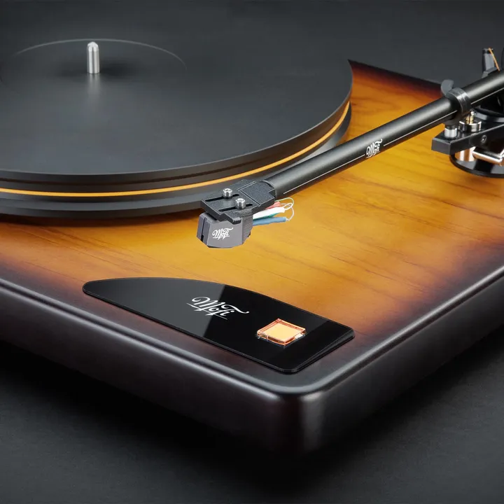 MoFi x Fender American Vintage Turntable fås i satinlakkert Sunburst-finish. Fabrikksmontert MasterTracker MM-pickup, støvlokk og tonearmskabel følger med.