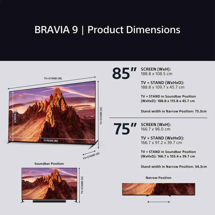 Sony Bravia 9 leveres i Dark Silver metallfinish. Premium bakgrunnsbelyst fjernkontroll følger med.