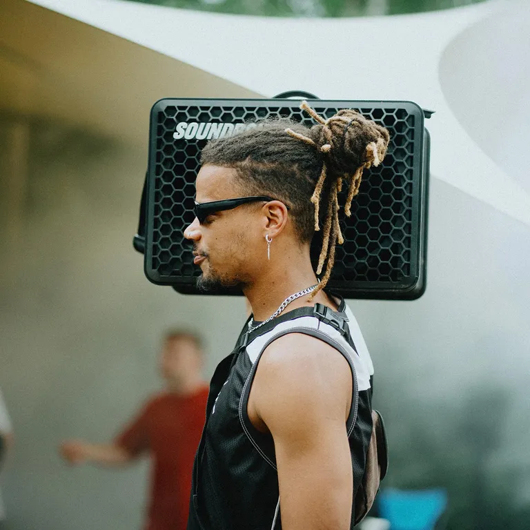 Med et ekstra batteri er du også klar for den neste dags party på festivalpassene, hvor det ikke direkte vrimler med ledige stikkontakter. SOUNDBOKS Go (USB-C) bruker det samme batteriet som i den større SOUNDBOKS 4 (USB-C), så du og vennene dine kan hjelpe hverandre med ekstra strøm, hvis en av dere skulle gå tom midt i festen. Du kan også bruke TeamUP funksjonen til å pare din og vennenes SOUNDBOKS trådløst – så kan du få enda mer lyd, og til og med nyte den i skikkelig stereo.
